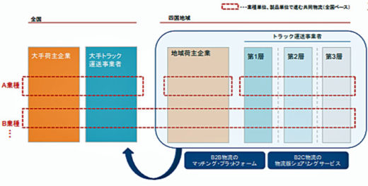 これは、F-LINEや大王製紙の共同物流の取り組みに代表されるように、全国で進む共同物流の取り組み主体は全国クラスの大手荷主企業と大手トラック事業者。四国に全国で進む共同物流の流れを取り込むためには、まずは四国域外との物流の窓口の役割を担う第1層が、全国的な共同物流・標準化プロジェクトに参画することが重要だとしている。