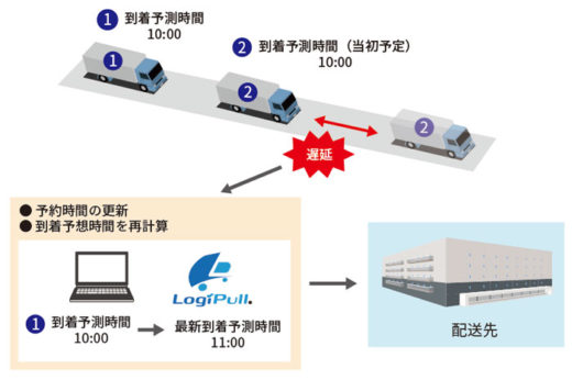 さらに、時間帯によって入場するトラックの増加で施設内に入場できず、道の駅やトラックステーションなどで一時待機が発生する問題を解決。GPS情報による到着予測時間とLogiPullの車両呼び出し機能を利用し、「着車バース番号指定」「構内待機場」など呼び出したい場所を指定してドライバーに通知し、施設入場・再入場時の車両誘導を効率化する。