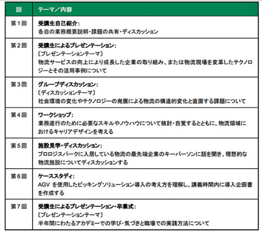 プログラムの対象は、プロロジスのカスタマー企業に勤務する若手人材を中心とし、少人数に限定して開講する。月に1度、全7回のカリキュラムは、物流業界の最新事例を取り入れたケーススタディ、プロロジスパークでの見学・現場検証など、実践的な内容で構成。ディスカッションや交流を重視し、受講生同士が物流の未来について語り合い切磋琢磨する場となることをめざしている。