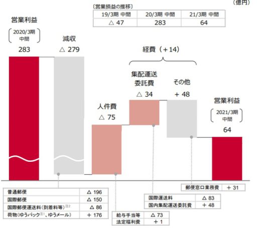 日本郵政が11月13日に発表した2021年3月期第2四半期決算によると、郵便・物流事業の売上高(営業収益)は9627億円(前年同期比2.8%減)、営業利益は64億円(77.1%減)となった。