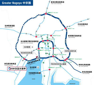 名古屋市中心部まで 25km/名古屋港鍋田埠頭コンテナターミナルまで 13km/中部国際空港セントレアまで 46km