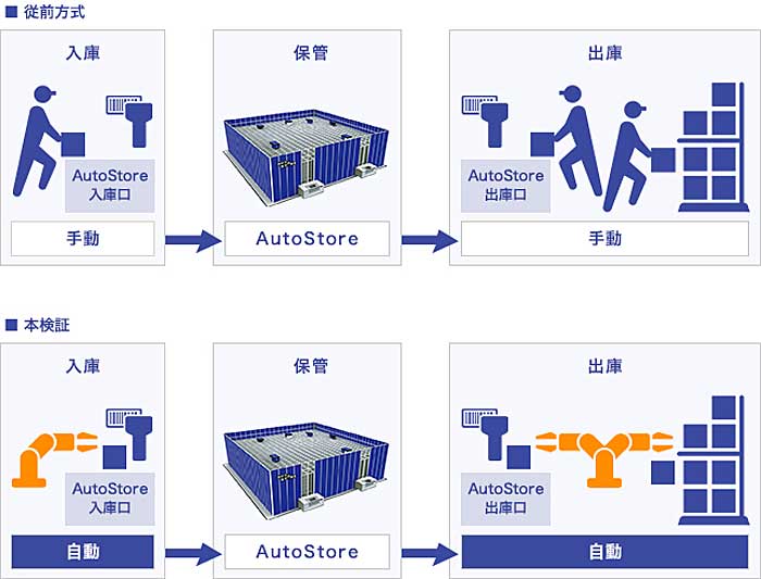 実証実験は、「AutoStore」の日本における正規販売店であるオカムラと協力して実施。従来は人手で行っていた「AutoStore」への荷物の出し入れを、ピースピッキングロボットを使って自動化する。