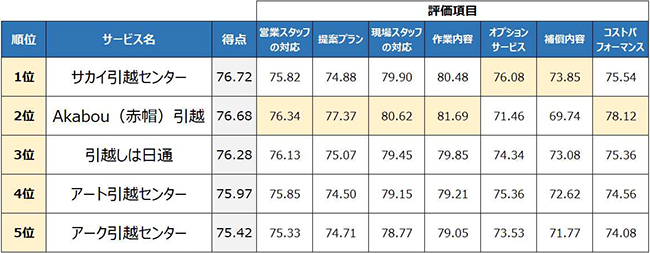 サカイ引越センターが2008年以来13年ぶりの総合1位に、アート引越センターが「近畿」で6年連続1位を獲得した。