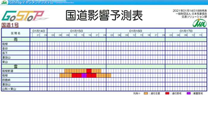 日本気象協会は1月21日、悪天候時の輸送安全を支援する物流向け月額定額制サービス「GoStop(ゴーストップ)マネジメントシステム」の新コンテンツとして、主要国道を対象とした輸送影響リスクを予測する「国道影響予測」の提供を、2月18日から開始すると発表した。