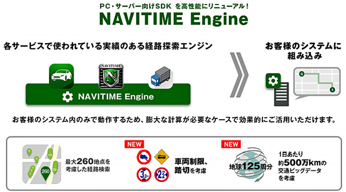 ナビタイムジャパンは1月26日、法人向け開発キット「NAVITIME SDK」のPC・サーバー向け経路探索エンジンを、「NAVITIME Engine」としてリニューアルし、あらたに、地域区分別・時間帯別の道路走行速度や、車両・車幅を考慮したルート検索、開かずの踏切を考慮したルート検索に対応すると発表した。