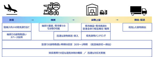 厳密な温度管理や迅速な輸入手続きなど高度な取扱いが求められる新型コロナウイルス感染症ワクチンの国内最初の窓口となる空港で、安全かつ確実な輸入、および搬送を行うため、物流に関わる関係者間で協議し、「迅速」と「安全」な輸送をコンセプトに貨物を最優先で取り扱い、ワクチンのリードタイムを極力短くする体制を構築した。