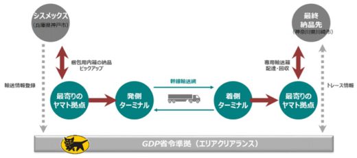 両社は、2020年11月~2021年1月にかけて同輸送の実証実験を実施。兵庫県神戸市から最終納品先のある神奈川県川崎市まで、専用輸送箱を活用した混載輸送を前提に超低温(-65℃以下)、冷凍(-20℃以下)、低温(2~8℃)の3温度帯で遺伝子検査用試薬を輸送し、GDPに準拠した輸送・品質条件であるかの評価と、輸送費について現行コストとの比較評価を行った結果、複数の温度帯で高品質・低コストなロジスティクスを実証できたことから、同輸送の実運用を開始することとなった。