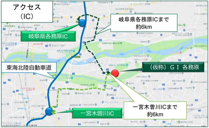 同施設は7月に竣工予定。東海北陸自動車道「一宮木曽川IC」「各務原IC」からともに6kmと至近で、工業団地内のため24時間稼働が可能な立地となっている。