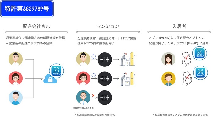 同特許を活用した機能によって、DXYZが提供するサービス「FreeiD (フリード)」と配送会社のシステムとを連動し、顔認証によるオートロックの解錠が可能となり、オートロックマンションでの置き配受け取りニーズに応えることが可能となる。
