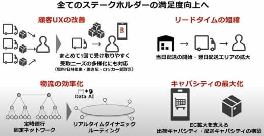 新会社では、これらの物流拠点を用いた物流DXプラットフォームを構築し、顧客体験の向上や、リードタイム短縮、物流効率化等を目指す。当初は楽天市場を中心とする楽天のECサービスの荷物を中心に取り扱い、将来的には他の配送会社や荷主も参加可能なオープンプラットフォームとすることで、国内の物流環境の健全化と持続可能な社会の実現につなげるとしている。