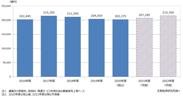 それによると、2020年度の物流17業種総市場規模は、コロナ禍で輸出関連の物流業種が大きなダメージを受けた一方、ステイホームを背景としたECや巣ごもり消費などの需要でラストワンマイルを中心とした配送網を担う物流業種は堅調なことから、20兆2375億円(前年度比0.8%減)を見込んでいる。
