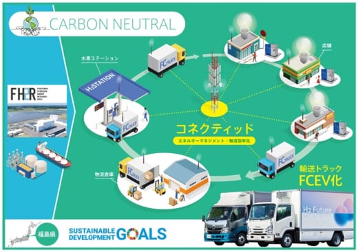 具体的には、浪江町の福島水素エネルギー研究フィールド(FH2R)で造られた水素を活用し、配送用として複数台の燃料電池(FC)トラックを導入。また、コネクティッド技術による運行管理や水素充填タイミングの最適化など、各地域の実情に応じたエネルギーマネジメントを実践していく。