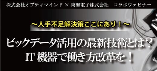 オプティマインドは7月5日、東海電子と共催でオンラインセミナー「~人手不足解決策ここにあり!~ビックデータ活用の最新技術とは? IT機器で働き方改革を!」を開催する。