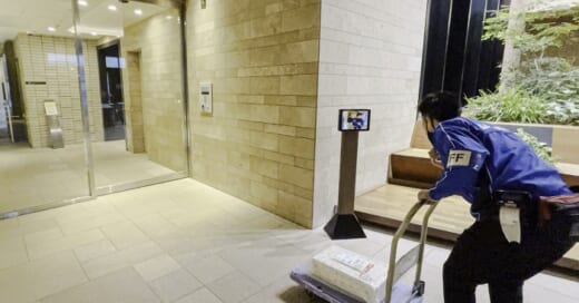 <顔認証でオートロックエントランスを通過する佐川急便の配達員>