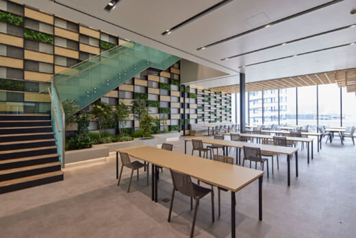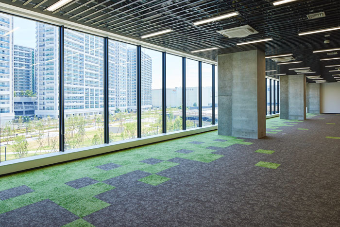 事務所の天井高は全フロア約3.6m を採用し、緑地空間を一望できる開放的なオフィス環境を実現。倉庫内は全館空調を実装し快適な労働環境を整備した。トラックバースは国際基準である45ftコンテナ車両にも全フロア対応可能とする他、免震構造・72時間対応の非常用発電機等のBCP対策や、車番認証システムを採用したト