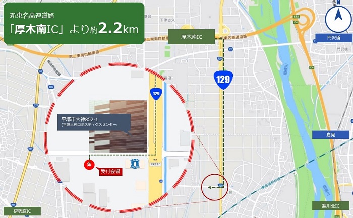 高速道路:新東名高速道路「厚木南IC」2.2km、小田原厚木道路「伊勢原IC」3.7km、東名高速道路「厚木IC」4.0km
