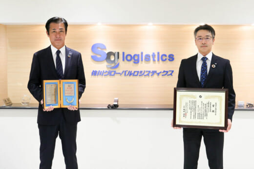 <表彰状を手に 本社エントランスにて(左から 佐川グローバルロジスティクス山本将典 社長、森田崇史 執行役員)>