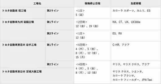 これに伴い、国内では本体の堤工場やトヨタ自動車九州の宮田工場など、全14工場28ライン中、4工場6ラインで最大5日間の稼働停止を予定している。