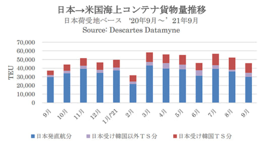 それによると、9月分の日本発米国向け(往航)のアジア域内へのトランシップ分を含む日本受け荷受地ベースは4万5763TEU(前年同月比22.8%増)で、世界規模でサプライチェーンが崩壊しかかっている中、7か月連続の増加となった。