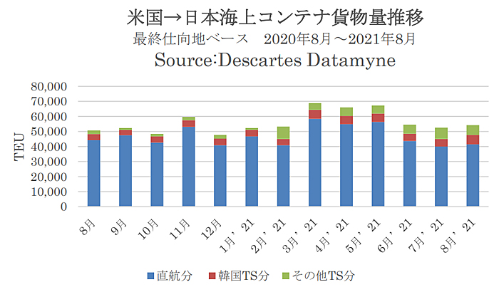 また、8月分の米国発日本向け(復航)の最終仕向国ベースは、5万4192TEU(6.8%増)となった。