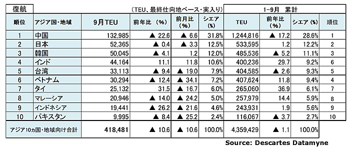 一方、米国発アジア主要10か国・地域向け(復航)の9月分は、41万8481TEU(10.6%減)となった。