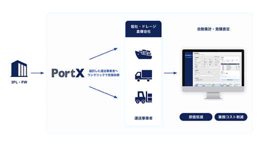 「PortX」は、見積もりの規格を統一、データ化、共有、再利用することによる「原価低減」と「業務コスト削減」を実現するサービス。ワンクリックで見積依頼を各運送事業者へ送信でき、空き状況や価格を軸に、回答の自動集計・即時査定を実現する。3PL事業者やフォワーダーは「PortX」による効率化で削減した時間を、よりプロフェッショナルな業務に時間を投下することができる。