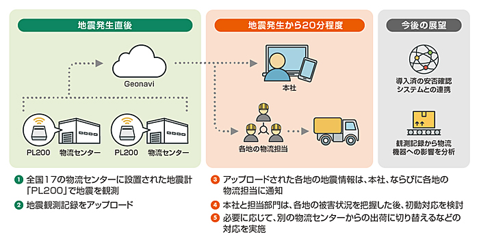 同サービスによって、全国の物流センターの被害状況が即座に把握できるようになり、初動対応体制が強化されたことで、2021年10月に発生した千葉県北西部を震源とする地震では、木曜日の22時41分という発生時刻ながら迅速な被害状況把握とその後の初動対応を可能にした。