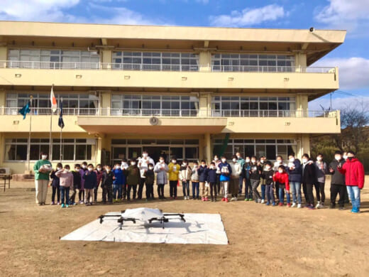 <小学校の生徒たちへバレンタインチョコレートを届けたドローンと記念撮影(豊浜小学校)>