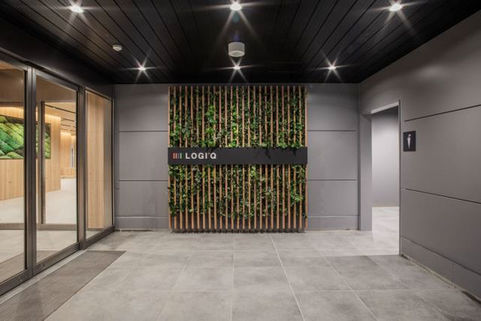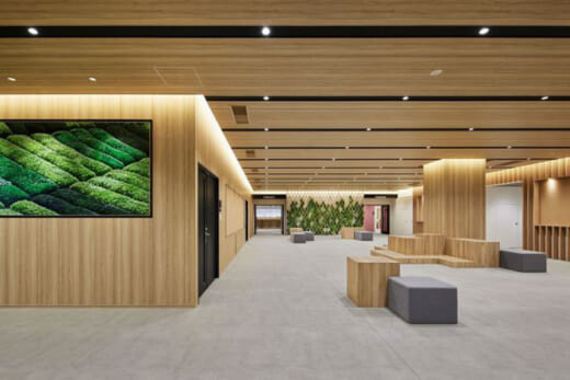 エントランスは、LOGI’Q の基本仕様であるルーバーにグリーンを装飾し、この地域の名物である狭山茶の茶畑をモチーフにしたアートを飾ることで、華やかな仕上がりとなっている。また、エントランスホールには、従業員連絡用掲示板や腰掛となるスツールを用意し、従業員が思い思いの時間を過ごすことのできる空間となっている。