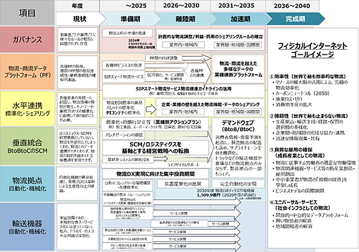 経済産業省と国土交通省は3月8日、フィジカルインターネット実現会議で、物流のあるべき将来像「フィジカルインターネット」を実現するため、2040年を目標としたロードマップを取りまとめたと発表した。