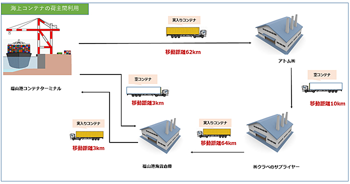 この取り組みでは、国際貿易港の福山港からアトムの本社工場(広島県竹原市)へ海上コンテナを輸送し、製品を荷降ろしした後、空になったコンテナを10km離れたクラベのサプライヤー工場に回送。工場で輸出用の自動車用耐熱電線材料を同コンテナに搭載した後、福山港近郊にある倉庫へ輸送し、輸出に用いる船社のコンテナに荷物を積み替えて福山港から輸出する。