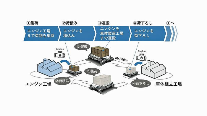 多用途UGVの活用により、従来から有人トラックで行っているエンジン運搬業務の効率化が期待されるとしている。