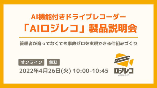 船井総研ロジは4月26日、同社の販売するAI搭載ドライブレコーダー「AIロジレコ」の製品説明会をオンラインで開催する。