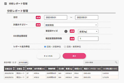 これまで「LYNA自動配車クラウド」では、帳票上でCO2排出量を計算して出力することでCO2排出量を把握できたが、新機能によって「LYNA自動配車クラウド」で立案した配車計画に対するCO2排出量を画面上で簡便に確認できるようになった。