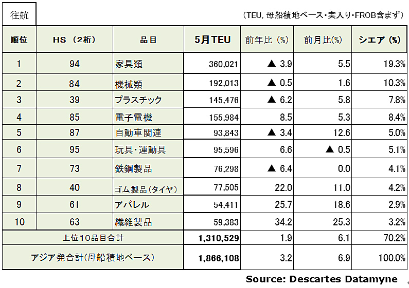 デカルト・データマインは6月10日、アジア発米国向け(往航)5月分と、米国発アジア向け(復航)4月分の海上コンテナ輸送量実績データを発表した。