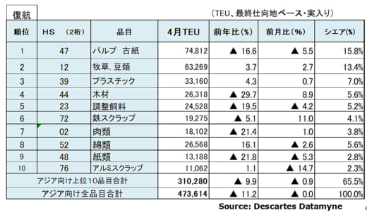 一方、米国発アジア主要10か国・地域向け(復航・最終仕向地ベース)の4月分は47万3614TEU(11.2%減)で、10か月連続のマイナスとなった。
