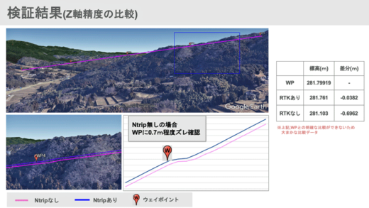 実験では、ドローンにソフトバンクのGNSS受信機「LC01」を搭載した上で、①湾曲が続いてる用水路:XY軸(平面)方向での誤差、②高低差が激しい山間部:Z軸(高さ)方向での誤差のルートについて、上空での正確な位置情報を取得。同時に、このデータとRTK測位「有り」と「無し」の測位情報を比較することにより、これらの精度を確かめた。