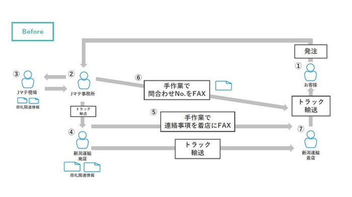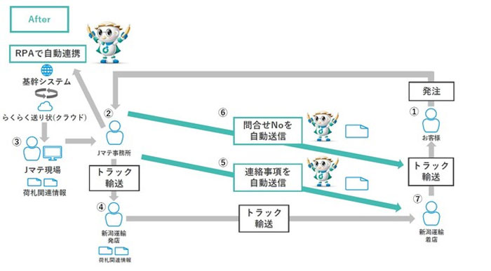 この製造と物流のDXプロジェクトは、同社の業務標準化の改善活動であるJPS(Jマテ生産方式)を新潟運輸に繋げていくことで、双方の事務所間でボトルネックであったドットプリンターによる送り状の廃止、送り状のFAX送信や電話連絡など従来から行われている業務を会社間の垣根を越えて「全体最適」の為の改善を図る取組みを両社間で合意した。新潟運輸で開発、提供しているクラウドシステム「送り状らくらく印刷システム」と同社の基幹システムをRPAにより連携することで開発期間を大幅に短縮し、効率的な業務プロセスの実現が可能となる。