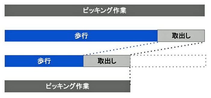 具体的には、作業者が出荷指示を受けた後、棚まで歩行する距離を最小化する。従来の属人的な出荷指示では作業者が同じルートを辿るなど必然的に歩行の無駄が発生していたが、同社のアルゴリズムによって、製品のロケーション、完了済み及び実施予定のタスク、作業者の位置などを考慮し計算することで、全作業員の歩行を最適化する。ピッキングの作業は大きく、「歩行」と「取出し」の作業によって構成されるが、そのうちの8~9割を占めている「歩行」の時間を最小化することで、ピッキング作業の最小化を実現する。