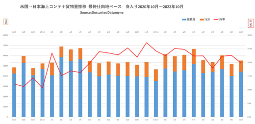 デカルト・データマインは12月21日、日本発米国向けコンテナ貨物量の11月分と、米国発日本向けコンテナ貨物量の10 月分の統計データを発表した。