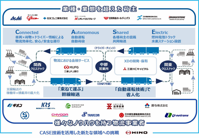 2019年12月の事業開始から約3年で、幹線輸送の省人化・効率化の取り組みにより、従来比で運送人員を43%削減、CO2排出量の28%削減を実現。業種業態を超えた荷主からの荷物を、総勢20社のパートナー各社が持つそれぞれの知見・ノウハウを融合し、幹線と支線を総合してコントロールし、輸送することで、「運送人員を1/6」、「CO2排出量ゼロ」を目指す。