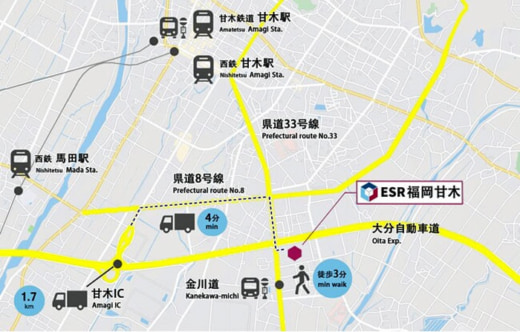 「福岡甘木DC」は、大分自動車道および県道33号線沿いにあり、大分自動車道の「甘木IC」から約1.7km(車で約4分)、大分自動車道と九州縦貫自動車道(九州自動車道)、長崎自動車道や国道3号など、九州の東西南北を結ぶ交通結節点で九州の物流の要所である「鳥栖JCT」から約14km(車で約14分)にあり、鳥栖エリアのサブマーケットと位置付けられ九州全域への配送を網羅できる好立地。