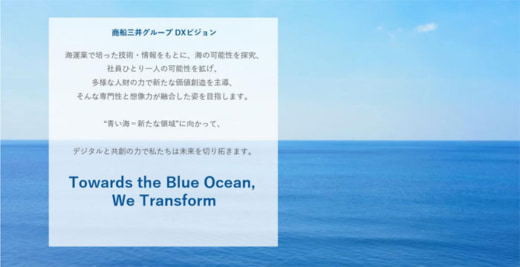 それらを融合させ、青い海、すなわち、同社の祖業である海運業に新たな変革をもたらし、その先にある新たな領域にむかって、デジタルと共創の力で未来を切り拓きたいという想いをビジョンに込めている。