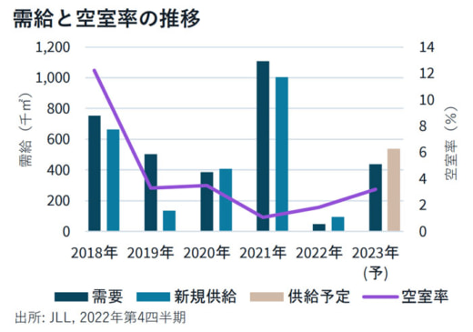 見通しでは、2022年は新規供給が少なく空室率は低水準で推移したが、2023年はベイエリアおよび内陸エリアで複数大型案件が進んでおり需給の緩和が見込まれる。立地によってはテナント誘致に時間を要する物件も予想されることから空室率は3-4%程度まで上昇すると予想される。