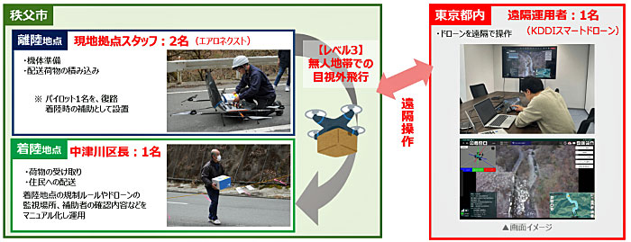 操作面では、3月2日の配送より、目視内での自動飛行で行う「レベル2」から、無人地帯での目視外飛行を行う「レベル3」での配送に移行した。さらに、着陸地点に技術者を配置せず、東京都内から遠隔操作を実施。荷物の受け取りを中津川区長1名で対応した。