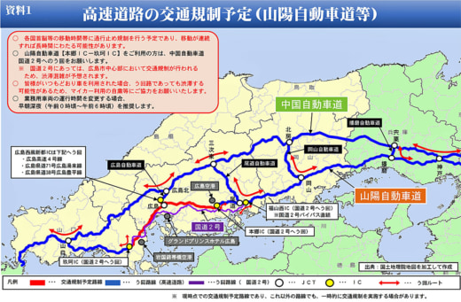 高速道路においても、5月18日から22日までの5日間、高速道路等における交通規制を実施する予定。交通規制の予定路線は、山陽自動車道の本郷IC~那珂IC、広島自動車道の広島JCT~広島西風新都IC、広島高速1号線、2号線、3号線、広島呉道路、海田大橋は全線となる。
