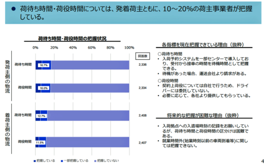 また、荷待ち時間の把握状況については、「把握している」と回答したのは発荷主では16.7%、着荷主では12.7%。荷役時間は発荷主が16.0%、着荷主が11.5%という結果だった。つまり、約8割の荷主が「把握していない」ということになる。