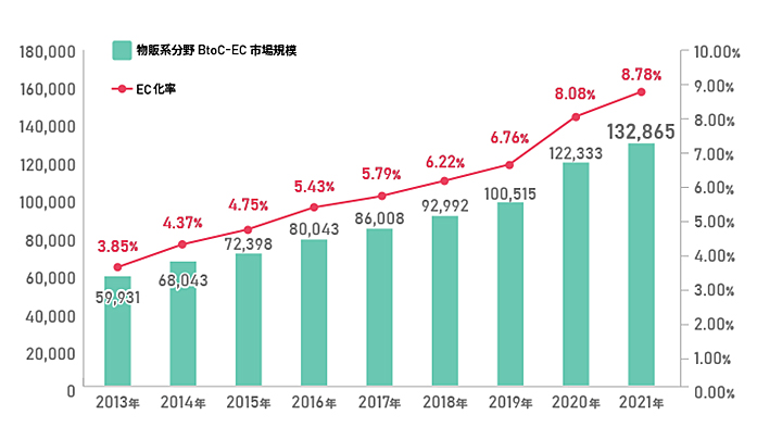 経産省が2022年秋に公表した「2021年度電子商取引に関する市場調査報告書」によると、2021年度の物販系のBtoC-EC市場規模は8.61%増の13兆2865億円、EC化率8.78%だった。