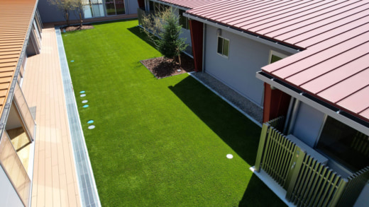 昨今の気候変動により猛暑の期間が以前よりも長期化しているが、従来の人工芝は強い日差しを受けると表面温度は70度を超え、素足で歩くことが困難になる。次世代環境配慮型人工芝「D-REY turf」は、独自開発した天然素材を利用しているため、従来の人工芝と比較して温度上昇を最大10度抑制できるため、夏場でも園児が安心して遊べるよう「D-REY turf」が選ばれた。