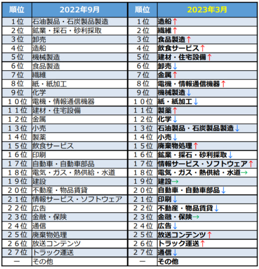 価格転嫁状況の業種別ランキング(価格転嫁の状況について、発注側企業の業種別に集計し、転嫁率順に並べた結果)では、2022年9月、2023年3月ともに順位は最下位の27位から変動はないが、コスト増に対する転嫁率は20.6%から19.4%に低下した。